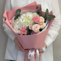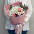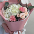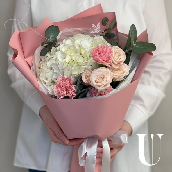 Букет в розовых тонах из гортензии, роз и диантусов в упаковке