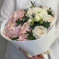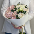 Букет из розовых гортензий, французских роз и белых альстромерий в упаковке