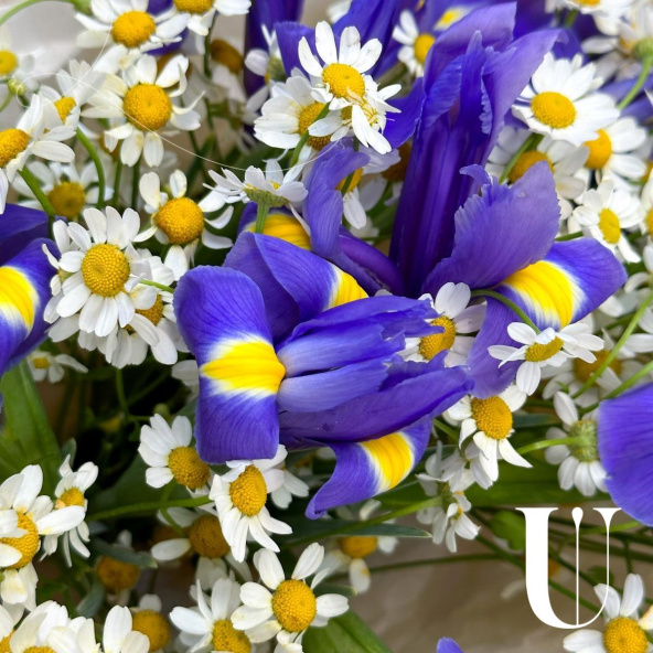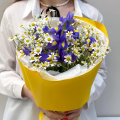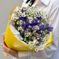 Букет из нежных гермини, синих ирисов и кустовой хризантемы в лавандовой упаковке