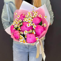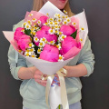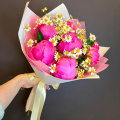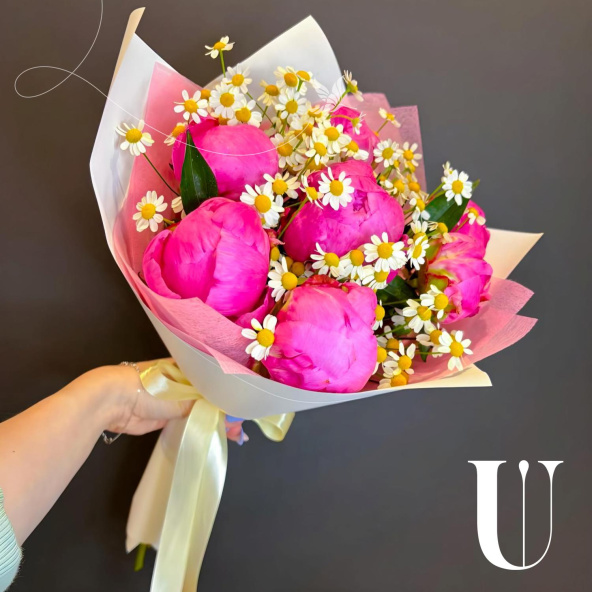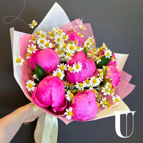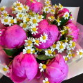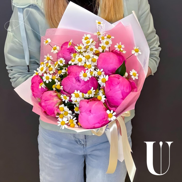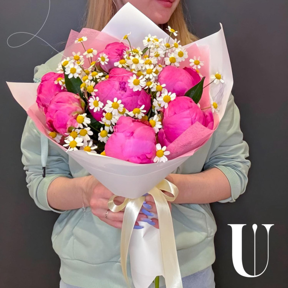 Изящный букет из 7 ярко-розовых пионов и мелких ромашек, оформленные белую и розовую упаковку.