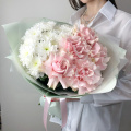Монобукет из нежно-розовых кустовых пионовидных роз сорта Мадам Бомбастик в упаковке