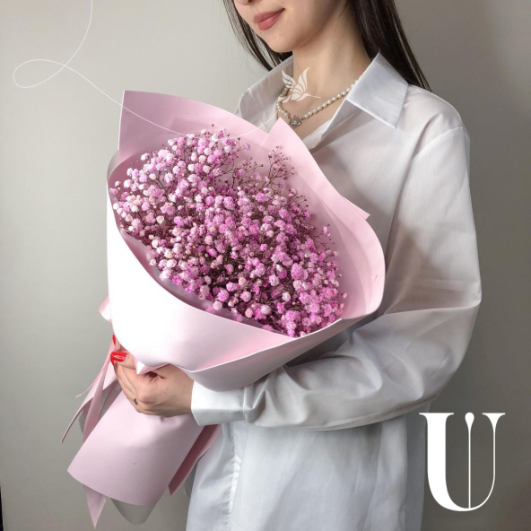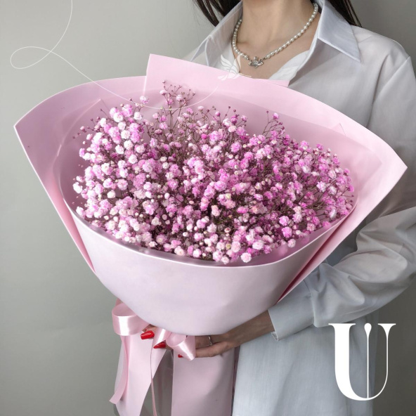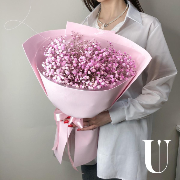 Монобукет из розовой гипсофилы в нежно-розовой упаковке