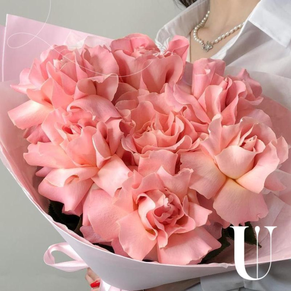 Букет из 7 розовых французких роз в белой упаковке