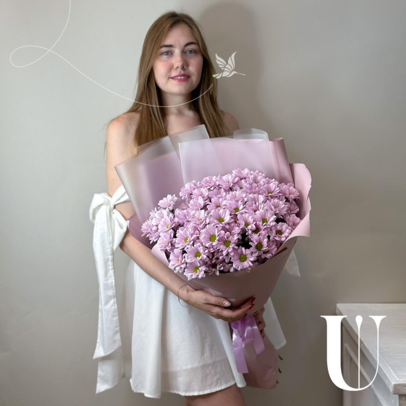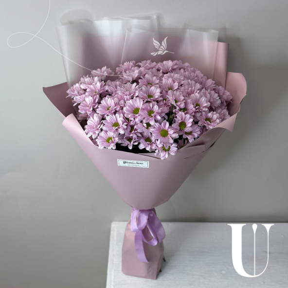 Букет из белых кустовых хризантем и эустомы в дизайнерской упаковке