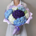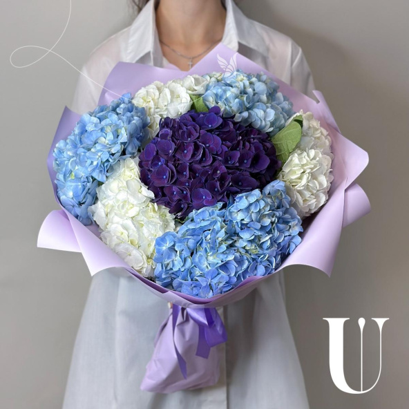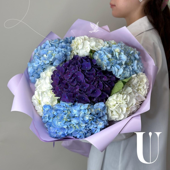 Монобукет из голубых и белых гортензий в дизайнерской упаковке